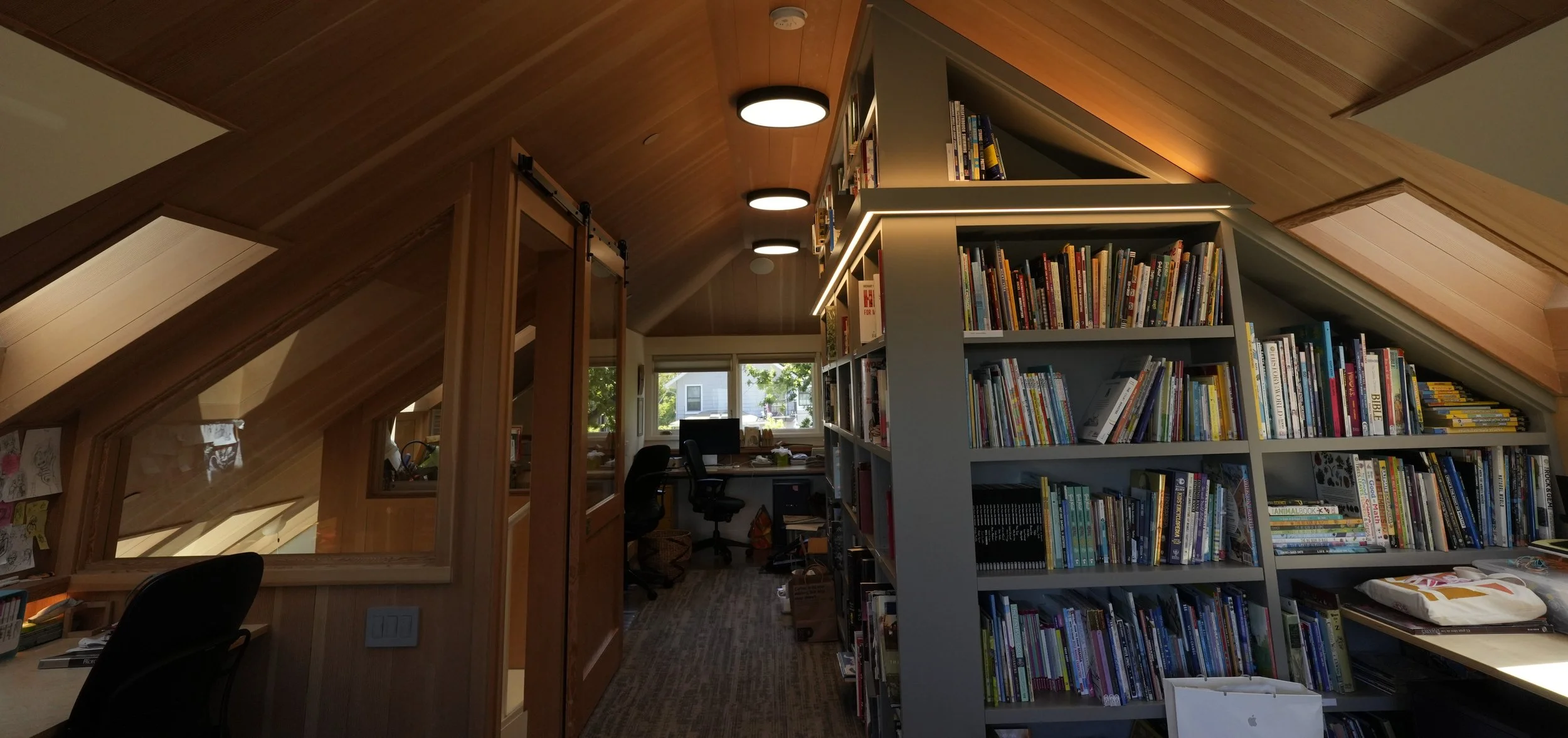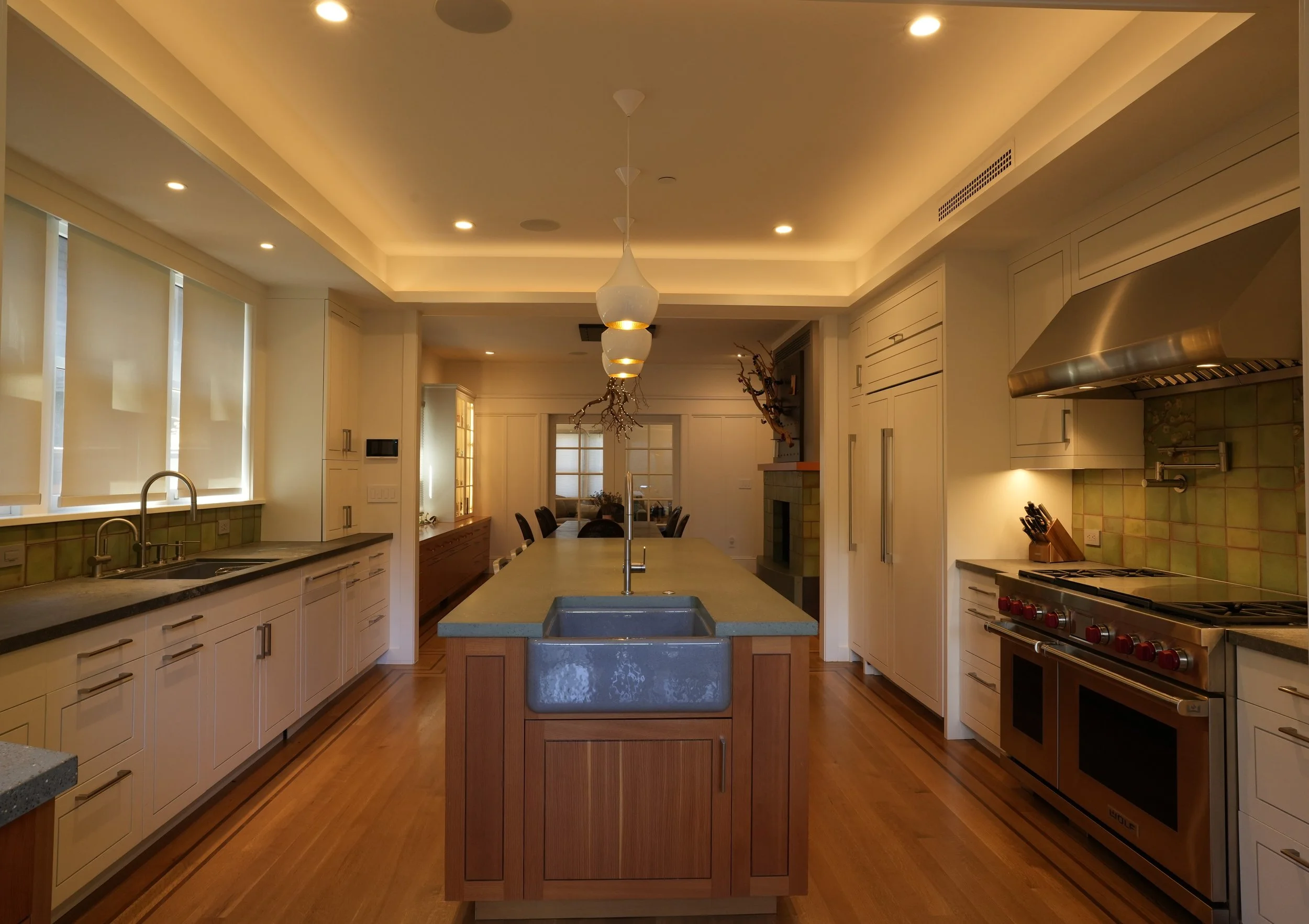 This gut renovation and expansion of a classic Berkeley craftsman included excavation for a full height basement and roof attic additions. Beautiful natural woods and fine joinery abounds as built-in cabinetry, casework, trim and furnishings are showcased in every room. Extensive use of LED linear up and specialty lighting highlights the exquisitely crafted architectural features.
